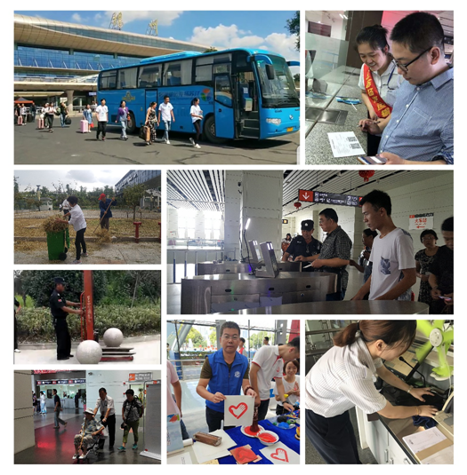 車(chē)站各班組分工協(xié)作打掃各自責(zé)任區(qū)域,清掃工作臺(tái)、參加"志愿服務(wù)  美好你我他"第三屆江蘇志愿服務(wù)展示交流活動(dòng)、清掃路邊綠化帶、噴灑藥水、除雜草滅蟲(chóng)害、整理通道入口、設(shè)備設(shè)施維護(hù)、消防安全檢查、身份實(shí)名驗(yàn)證、檢查危險(xiǎn)禁運(yùn)物品、檢查客車(chē)安全帶、為特殊旅客提供一站式服務(wù)、熱情引導(dǎo)購(gòu)票、候車(chē),征詢(xún)旅客意見(jiàn)、開(kāi)展問(wèn)卷調(diào)查,以整潔的站區(qū)環(huán)境、良好的精神風(fēng)貌和優(yōu)質(zhì)的候乘服務(wù)當(dāng)好東道主,文明迎盛會(huì)。