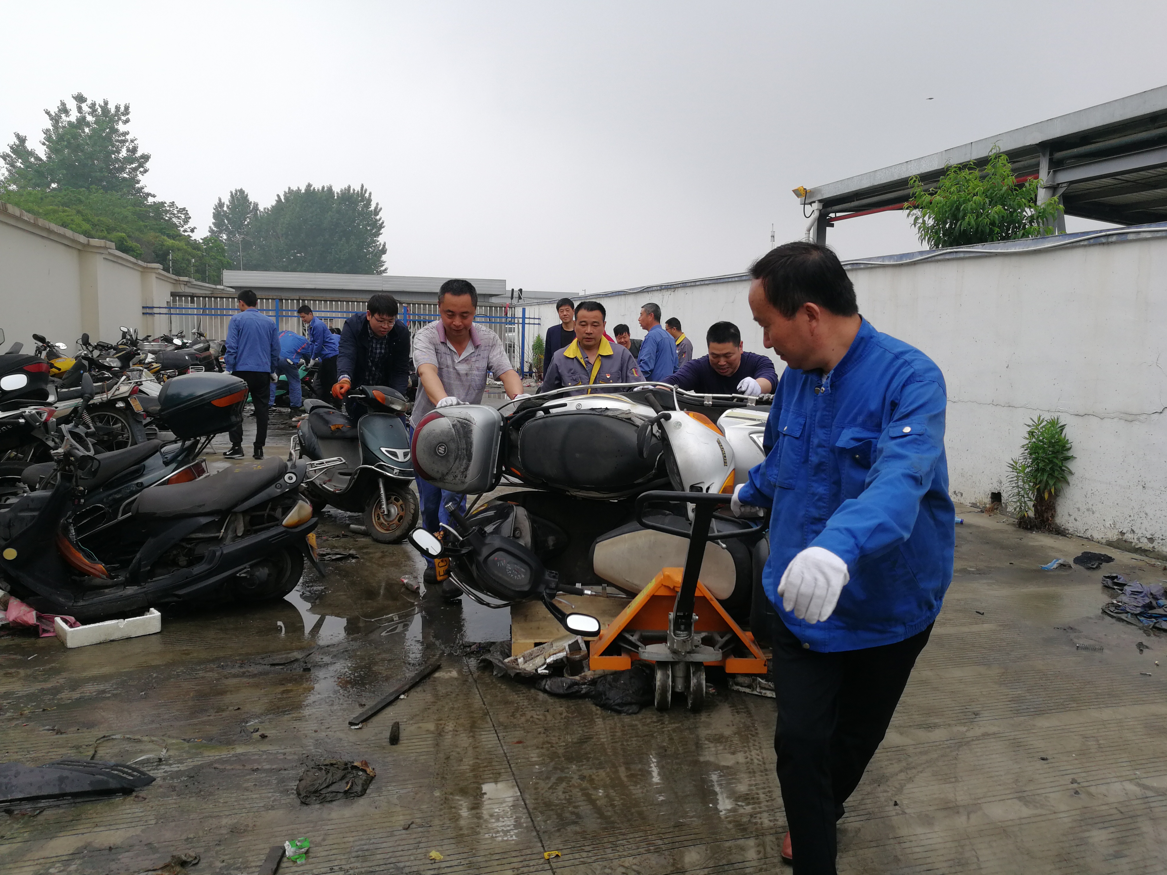 8時(shí)15分搬運(yùn)工作正式開(kāi)始,針對(duì)輪軸銹蝕、車輪變形、車輪遺失、車輪鎖死等不同情況的扣押車輛,大家使用車輪托架、電動(dòng)三輪、托盤(pán)叉車等輔助搬運(yùn)工具,共同協(xié)作,聽(tīng)從指揮,一步一步移至指定區(qū)域。經(jīng)過(guò)兩個(gè)半小時(shí)的高效協(xié)作,大家克服場(chǎng)地臟亂和天氣的悶熱,將靠近天燃?xì)饧託庹疽粋?cè)的車輛全部清理完畢,扣押場(chǎng)地車輛在指定停放區(qū)域擺放整齊,消除了安全隱患。