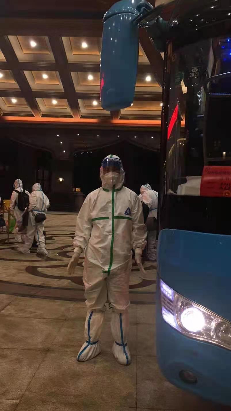 由于南京的疫情有所好轉(zhuǎn),家鄉(xiāng)揚(yáng)州的疫情又突發(fā),7月31日接到通知返回?fù)P州繼續(xù)“作戰(zhàn)”。回到揚(yáng)州后到疾控中心做完核酸檢測一切正常,并前往酒店進(jìn)行隔離,準(zhǔn)備全身心投入后續(xù)轉(zhuǎn)運(yùn)工作。每當(dāng)執(zhí)行轉(zhuǎn)運(yùn)任務(wù)時(shí),穿著防護(hù)服、戴著護(hù)目鏡開車,對有豐富駕駛經(jīng)驗(yàn)的他來說,仍是一個(gè)不小的挑戰(zhàn),全身被包裹得密不透氣,行動十分不方便,必須高度集中精神,小心駕駛確保行車安全。談及轉(zhuǎn)運(yùn)工作,魏建也記不清轉(zhuǎn)運(yùn)了多少趟隔離人員了,反正每趟任務(wù)都安全保質(zhì)保量的完成了。