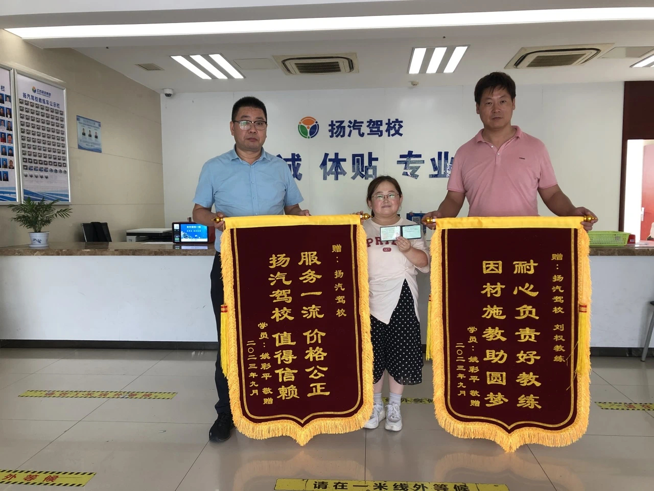 9月27日上午,在揚汽駕校西部樞紐招生大廳內(nèi),昨天剛?cè)〉肅2駕照的學(xué)員姚彩平,將“服務(wù)一流、價格公正、揚汽駕校、值得信賴”、“耐心負(fù)責(zé)好教練、因材施教助圓夢”兩面錦旗送到了揚汽駕校主任顧軍和她的教練劉權(quán)的手上,感謝駕校工作人員和教練在她學(xué)車期間的認(rèn)真教學(xué)、辛苦付出。