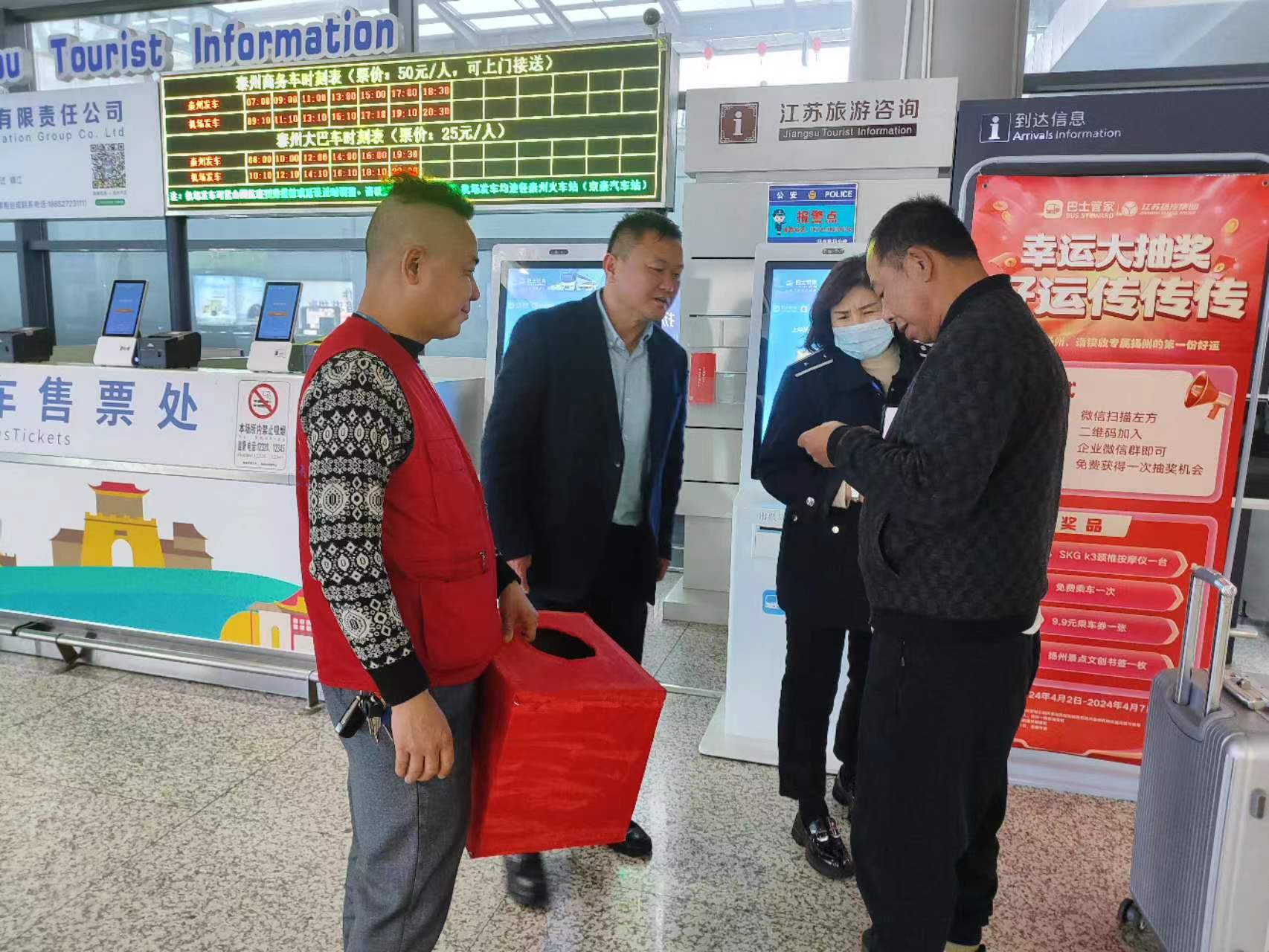 在抽獎活動現(xiàn)場,相關(guān)負責(zé)人與旅客進行了交流互動,介紹了活動的主題和參與方式,講解了機場專線的運營模式和專線停靠站點和走向,熱情地向旅客介紹了揚州的旅游景點,同時,認真聽取了現(xiàn)場廣大旅客對機場專線建議。