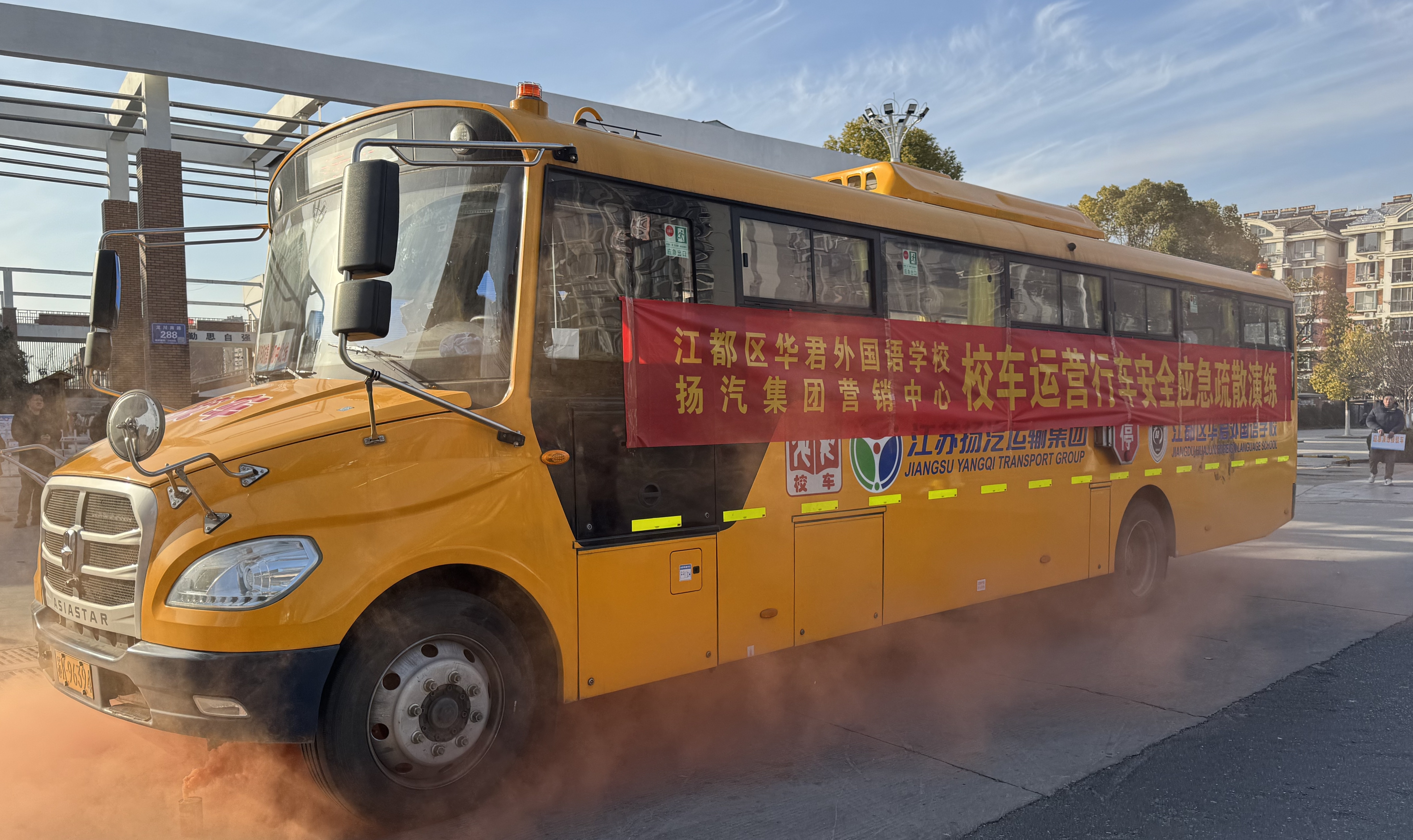 為進一步加強校車安全管理,提高師生在校車行駛中的安全應急疏散能力,近日,揚汽集團與江都區(qū)華君外國語學校聯(lián)合開展了校車運營行車安全應急疏散演練。揚汽集團副總經(jīng)理劉旭亮,江都區(qū)華君外國語學校副校長張?zhí)毂,各單位的安全管理人員及師生共40余人參加本次活動。
